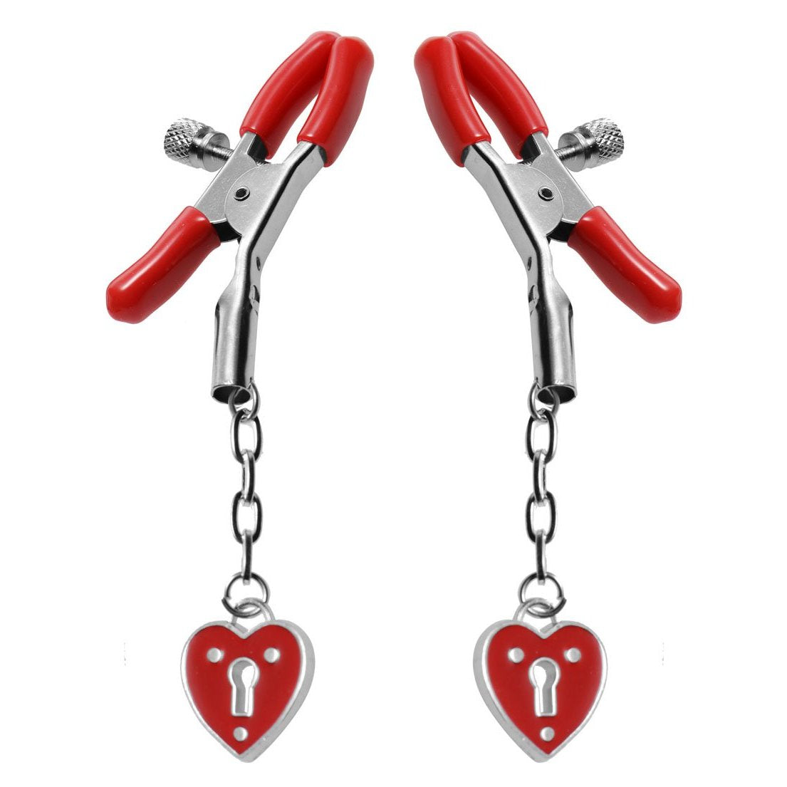 These easy to use clamps have a simple screw-down design, accented with heart shaped padlock detailing. The vinyl coated tips allow for a comfortable and secure grip while the red lacquered heart accent dangles enticingly from the end. The screws on the sides allow you to control just how much pressure your partner receives.