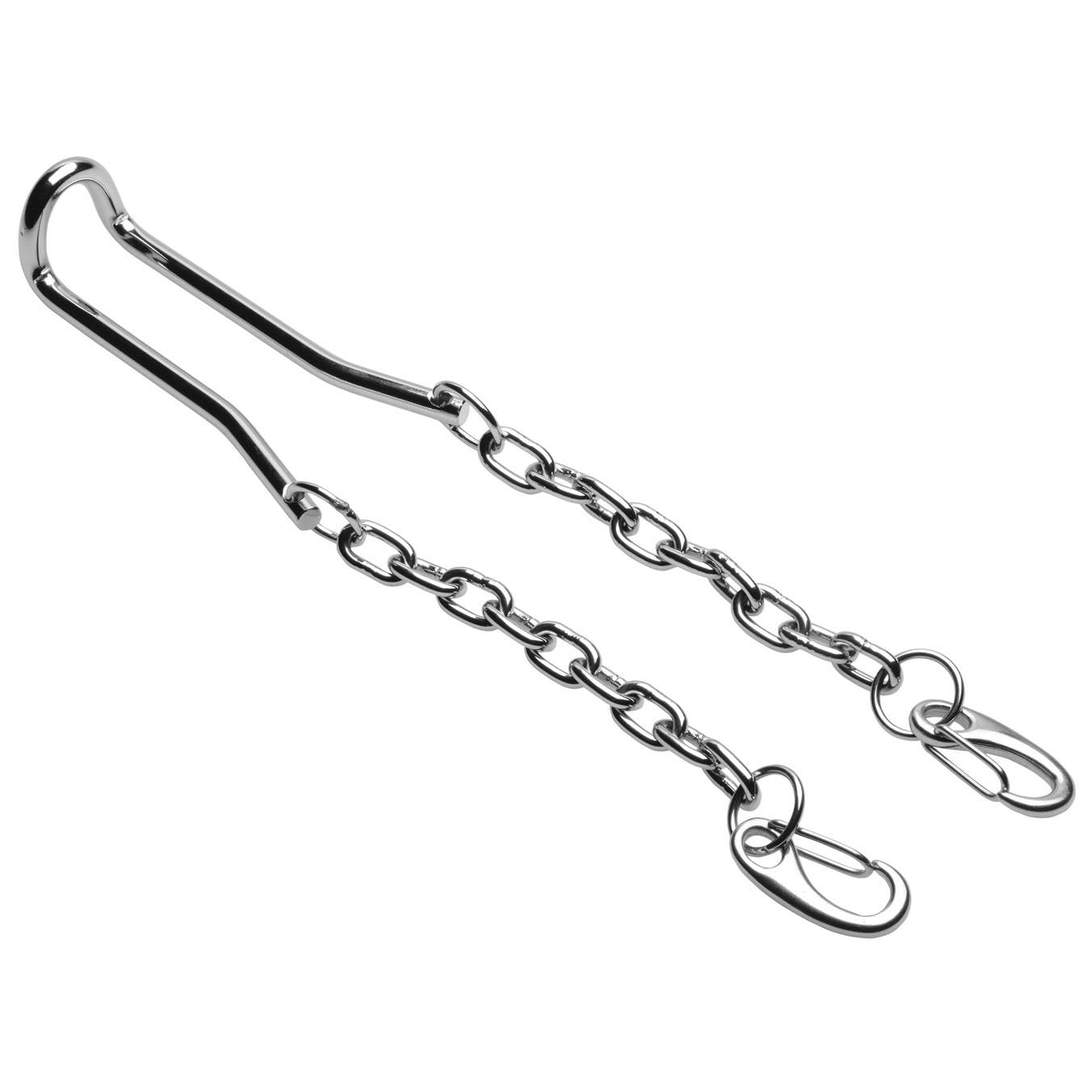 This unique ball stretcher will allow you to test your limits! Start with a manageable tug by slipping the U portion of the stretcher onto your scrotum above your balls. Savor the pull of the heavy-duty stainless steel as gravity takes it toll! Two connector chains dangle with convenient hooks for adding weights. How much can you handle? Play on your own or with your Master or Mistress!