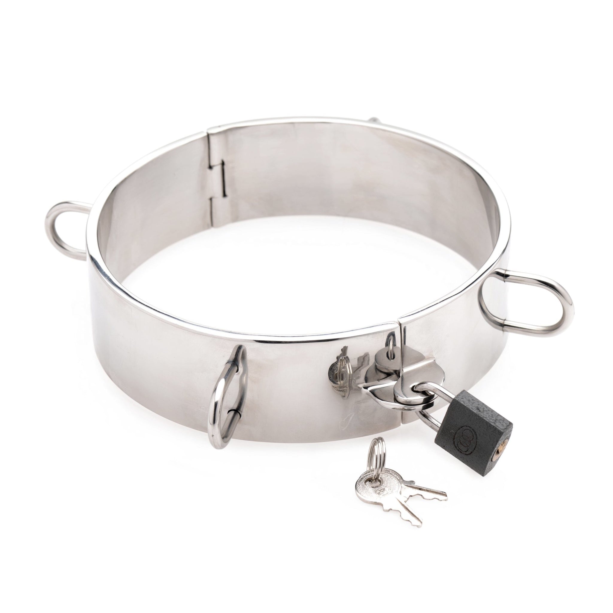 This alluring collar is a sight to behold! Lock it onto your partner to remind them that they are your most precious property. Four d-rings serve as attachment points so that you can connect a leash, chains, cuffs, or any other bdsm accessories that will enhance you scene further. The striking stainless steel will look and feel luxurious against the supple skin of your plaything. This heavy collar is great for roleplayers or lifestylers who are interesting in making an impression at home or at a play party.