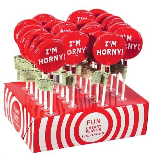Inform the world around you that you are special and need attention.. now. Each coin shaped cherry flavored lollipop read's "I'm Horny" for a fun and sweet sucking.