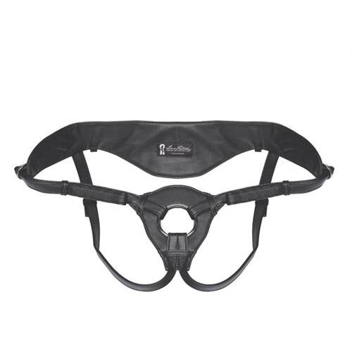 Get deep with the Patent Leather Strap-On Harness. This sexy supple leather harness can accommodate any dildo with a flared base and includes 2 rubber holder rings. Perfect for new initiates just discovering the joys of deep penetration or for experts looking to add another tool to their arsenal. 4-way adjustable straps fit hips up to 60-inches.