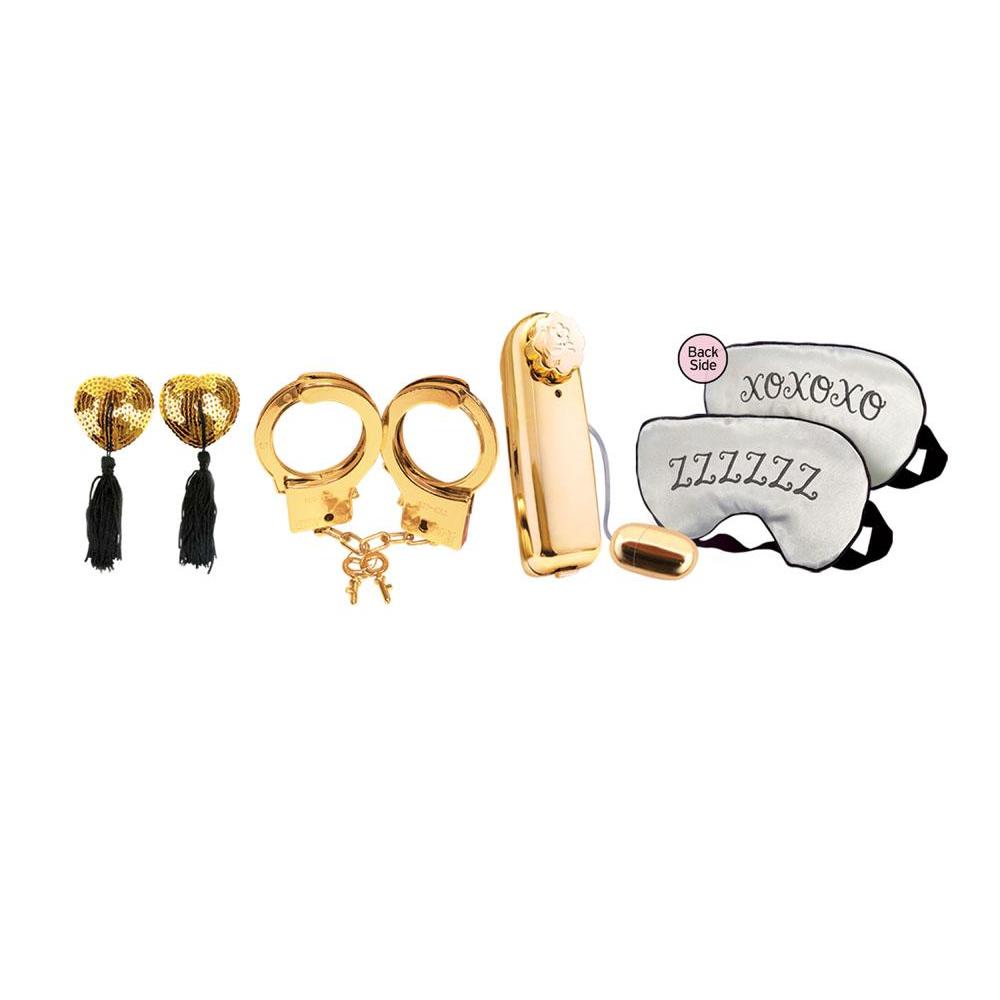 The blindfold that says it all; gold handcuffs, a vibrating gold bullet, and gold nipple tassels... what could be better? (We know...bullion). The Rich Bitch Kit...for those who come into money.