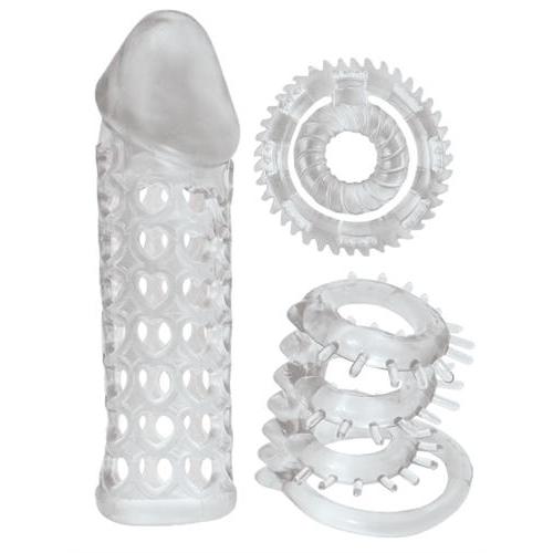 Keeps you rock hard. Kit includes Stimulating sleeve penis extender Double cock ring and 4 cock ring combo. Super stretchy and ribbed for texture. Fist most men.