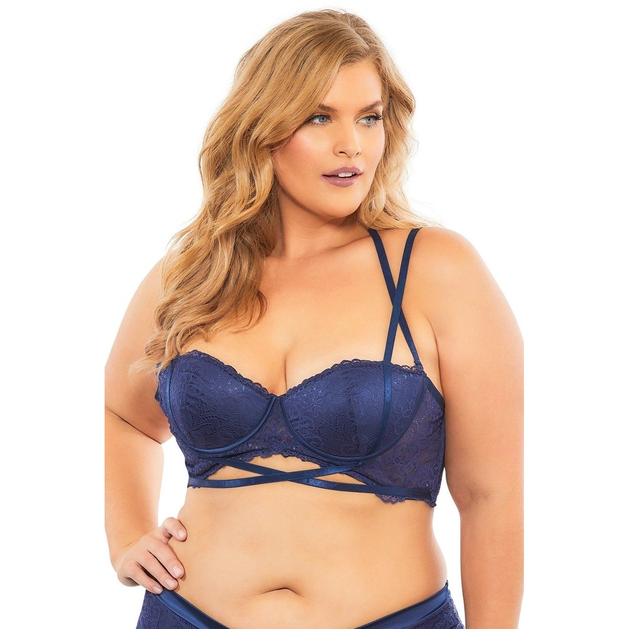Lace Push Up Balconette Bra With Crossing Halter Straps - Estate Blue - 2x