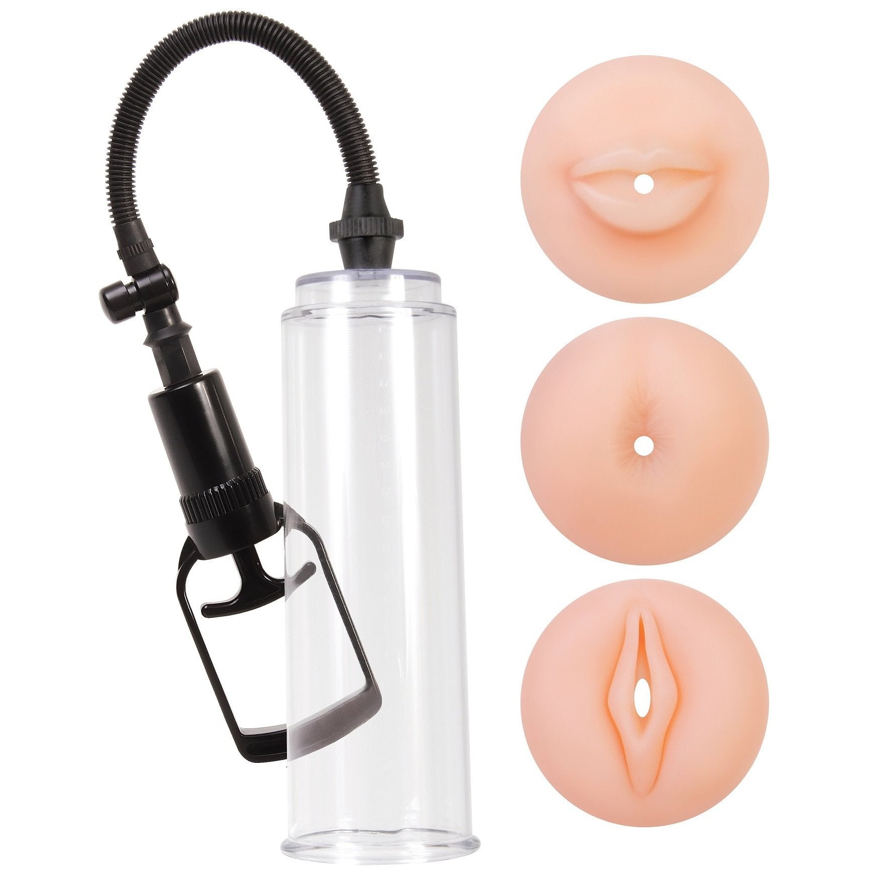 Realistic entries made from silky fleshy TPR material Vacuum pump brings increased blood flow to penis Experience longer, thicker erections No-crimp air hose means smooth, fast pumping 8.5" x 3" vacuum pump ABS cylinder Gradations on pump allow penis measurement Easy grip handle for ultimate comfort Use with water-based lubricant