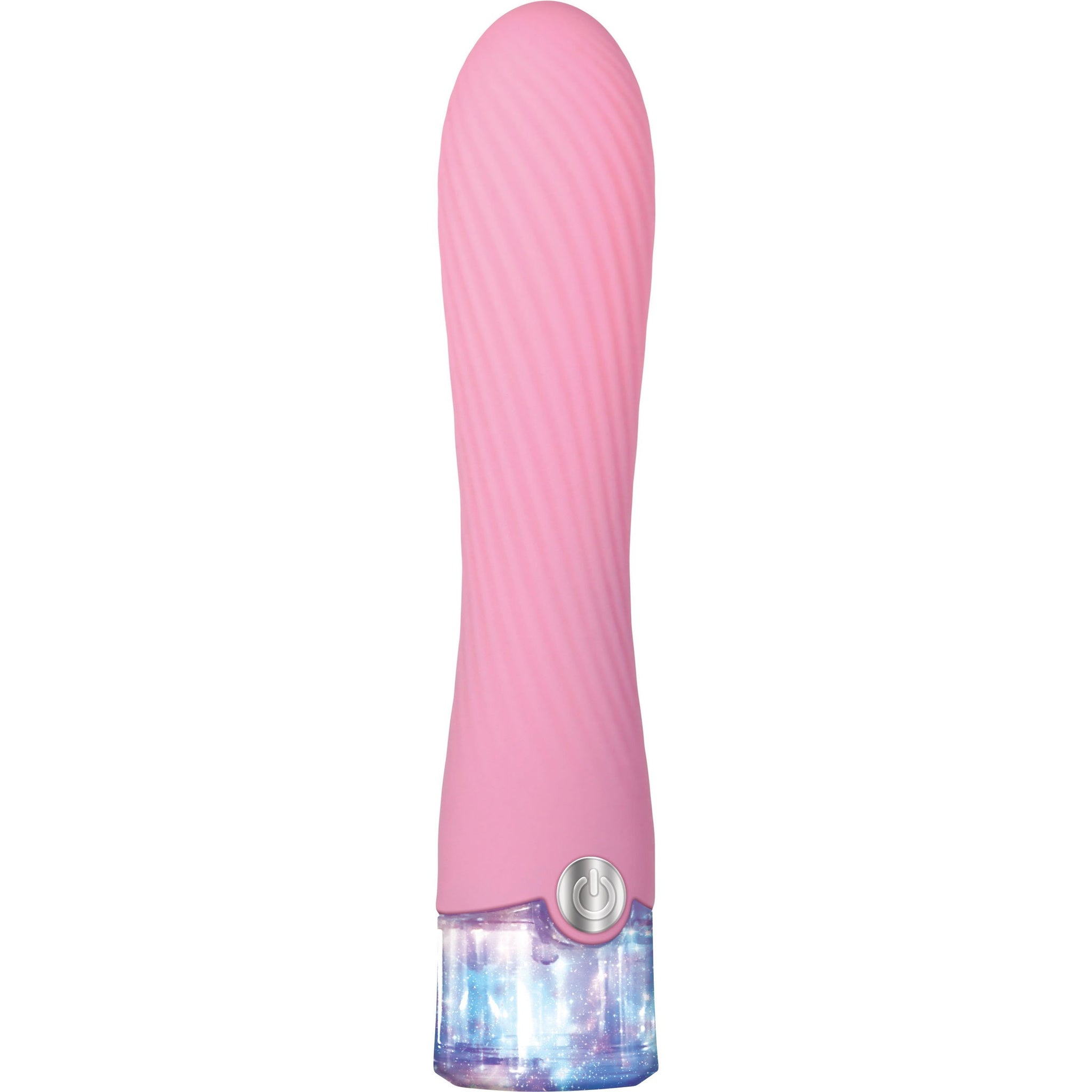 Ride the magical pleasure wave of your favorite fantasy while holding onto a glitter-filled vibe handgrip! 10 powerful speeds thunder through the twisted-groove-textured shaft that swells and tapers in the most delicious body-hugging way. The colorful LED light helps your navigate your desire - even submerged under water!